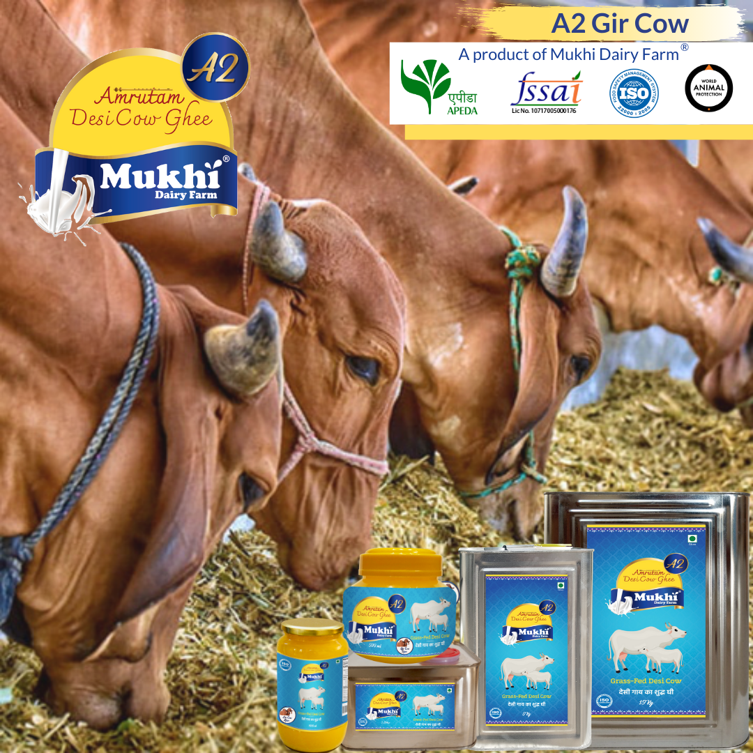 Mukhia Amrutam A2 Desi Cow Ghee is made from the A2 milk of desi cows, which is believed to have certain health benefits according to Ayurveda. The ghee is prepared using traditional Bilona churning methods, ensuring its authenticity and quality. Mukhia emphasizes the use of 'Makkhan' churned from curd, rather than cream, in the ghee-making process.