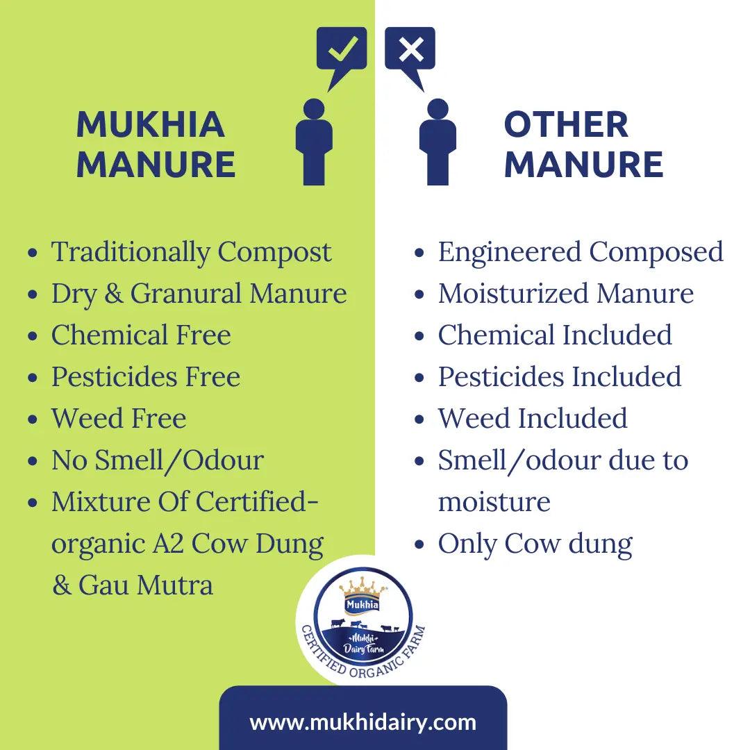 The Mukhi Organic manure is chemical and pesticide free, as we don’t add any pesticides or chemical on our organic farm/grasslands, which we feed to our Mukhia Cows. Our healthy cows eat organic certified grass that results to chemical and pesticide free manure.